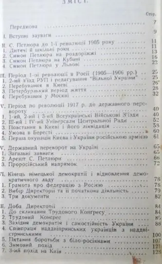 Зміст: 1.Вступні зауваги. 2.С.Петлюра до 1-ї революції 1905 року. 3.Період 1-ї революції в Росії (1905-1906 рр.). 4.Період по революції 1917р. до державного перевороту. 5.Державний переворот на Україні. 6.Кінець німецької демократії і відновлення демократичного ладу. 7.Доба Директорії. 8.Питання меншостей в Україні. 9.С.Петлюра на еміграції. Велика кількість раніше невідомої інформації. Рідкісні фотографії, в т.ч. фото власноруч написаного листа С.Петлюри в ЦК Української Соціал-Демократичну Партію в 1919 р.; фото могили Петлюри в Парижі і т.д.«Зміст» - дивись фото. Вага книги 260 гр.