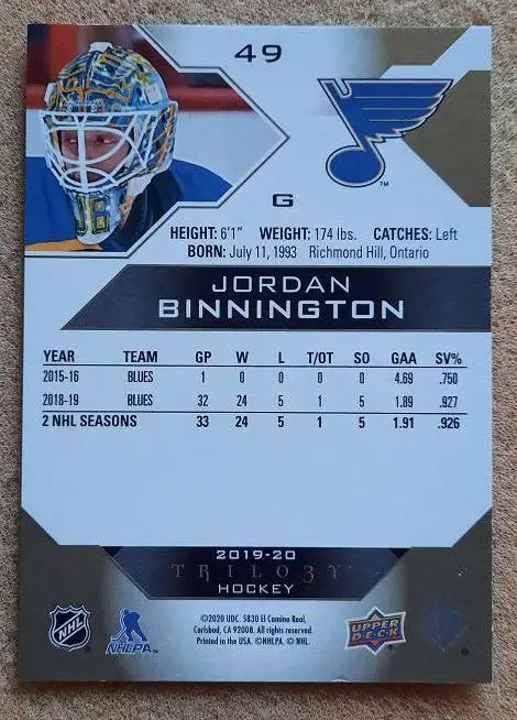 карточка хоккей НХЛ Джордан Биннингтон Сент-Луис Блюз № 49 выпуск