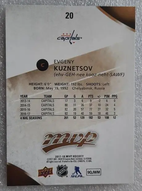 карточка хоккей НХЛ Евгений Кузнецов Вашингтон Кэпиталз Трактор Челябинск № 20 выпуск 2017-18 Upper Deck MVP, состояние на фото