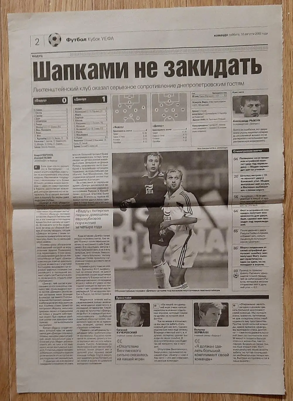Вирізка з газети Команда #153 16.08.2003 Вадуц - Дніпро