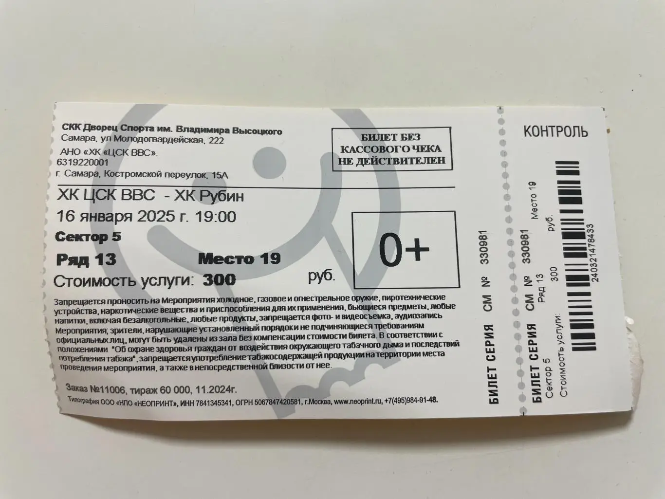 Билеты ХК ЦСК ВВС (Самара)-ХК Рубин (Тюмень) 2024/25