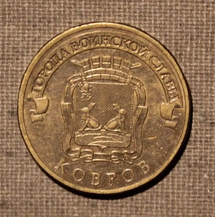 Продается юбилейная монета России из серии "Города воинской славы" номиналом 10 рублей, посвященная городу Коврову, 2015 спмд (монетный двор Санкт-Петербурга). Состояние на фото.
