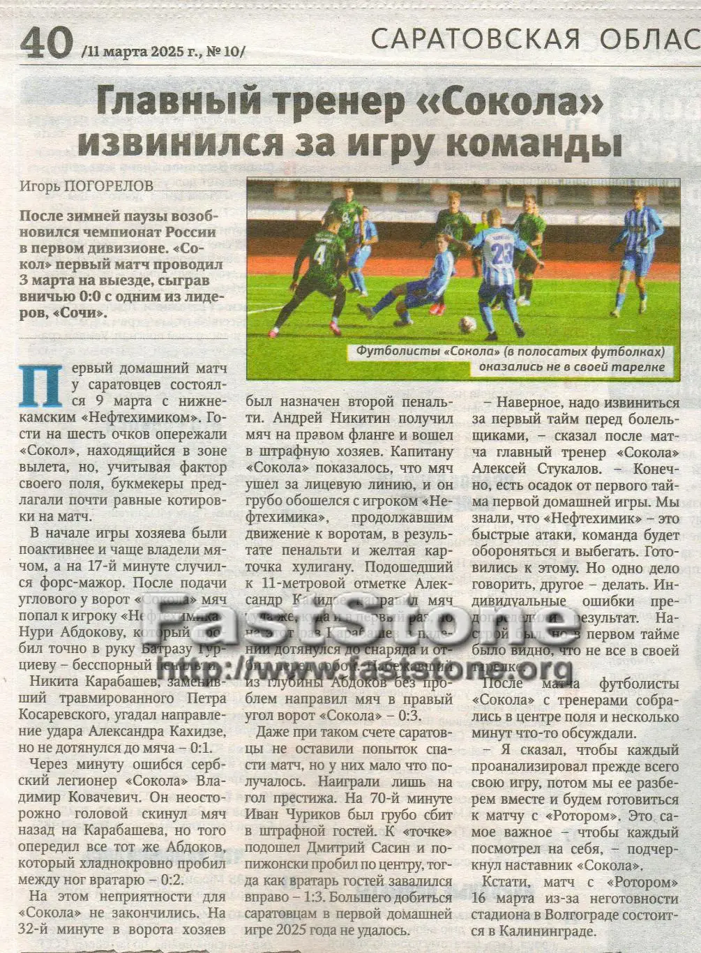 Сокол Саратов – Нефтехимик Нижнекамск 09.03.2025 Газетный отчет