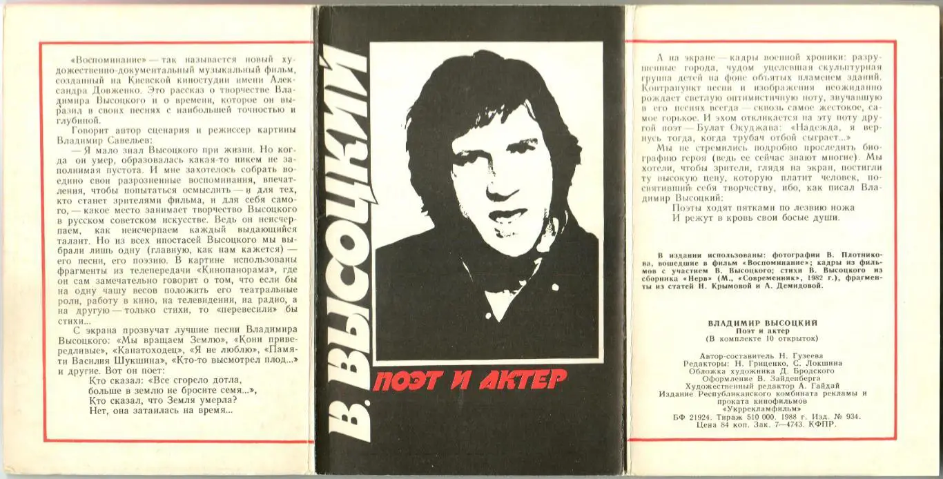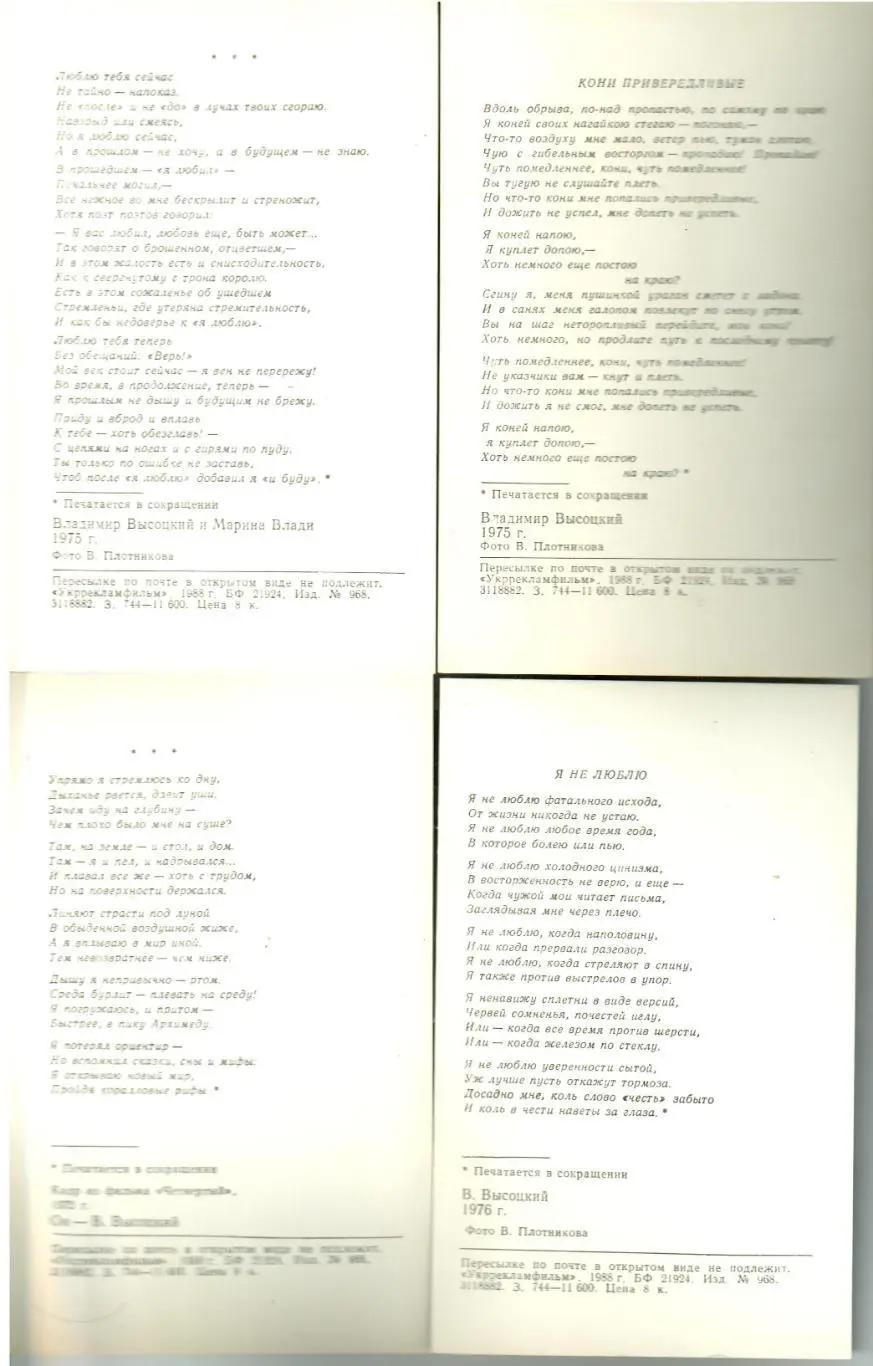 Набор открыток 10 штук (1 сторона – фото, 2 сторона - стихи или цитаты). Издание Республиканского комбината рекламы и проката кинофильмов "Укррекламфильм". Состояние - отличное (затемнения на сканах - результат работы сканера)