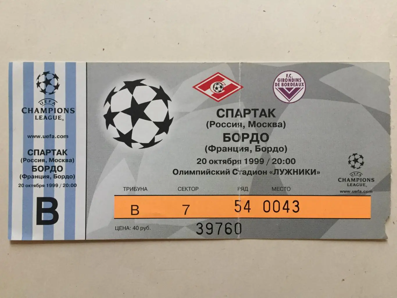 Билет.Лига чемпионов Спартак (Москва) - Бордо Франция 20.10.1999