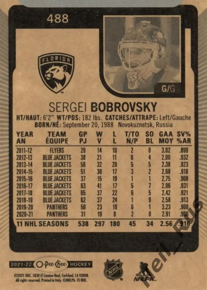 Карточка Сергей Бобровский (Florida Panthers, Металлург Новокузнецк/СКА) НХЛ КХЛ