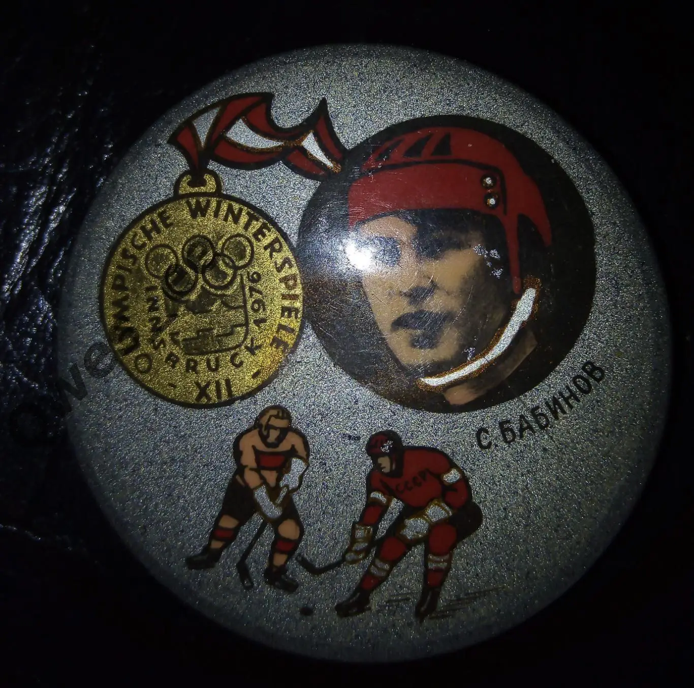 Значок хоккей с шайбой олимп. чемпион С. Бабинов сб СССР и ЦСКА Москва 1976 г