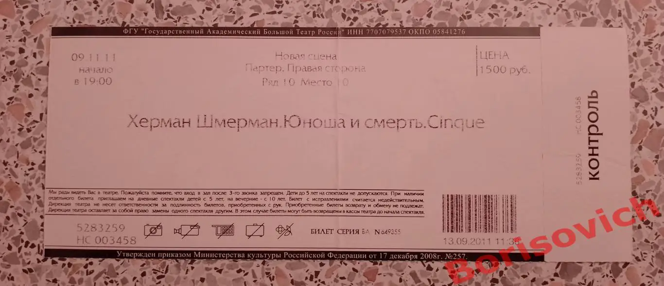 БИЛЕТ Большой театр HERMAN SCHMERMAN / ЮНОША И СМЕРТЬ 2011БИЛЕТ Большой театр HERMAN SCHMERMAN / ЮНОША И СМЕРТЬ 2011 1