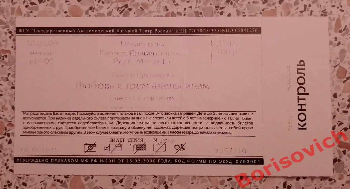Билет Большой театр С. Прокофьев ЛЮБОВЬ К ТРЁМ АПЕЛЬСИНАМ 2009