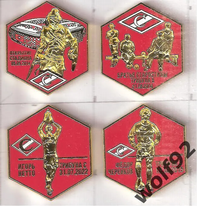 Каждый из 4-х знаков, входящих в набор, имеет следующие схожие характеристики : тяж. металл (цвет металла - "золото"), синтетическая (твёрдая) эмаль, 3D технология, размер 40х35 мм, тип крепления - 2 цанги, расположенные горизонтально, состояние - хор. - см. скан. Продажа - только набором.