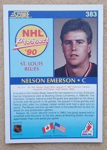 карточка хоккей НХЛ Нельсон Эмерсон Сент-Луис Блюз № 383 выпуск 1990-91 Score Hockey
