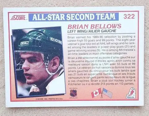 карточка хоккей НХЛ Брайан Беллоуз Миннесота Норт Старз № 322 выпуск 1990-91 Score Canadian Hockey