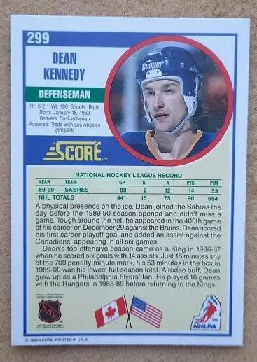 карточка хоккей НХЛ Дэн Кеннеди Баффало Сейбрз № 299 выпуск 1990-91 Score Hockey
