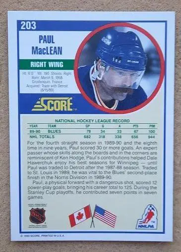 карточка хоккей НХЛ Пол Маклин Сент-Луис Блюз № 203 выпуск 1990-91 Score Hockey