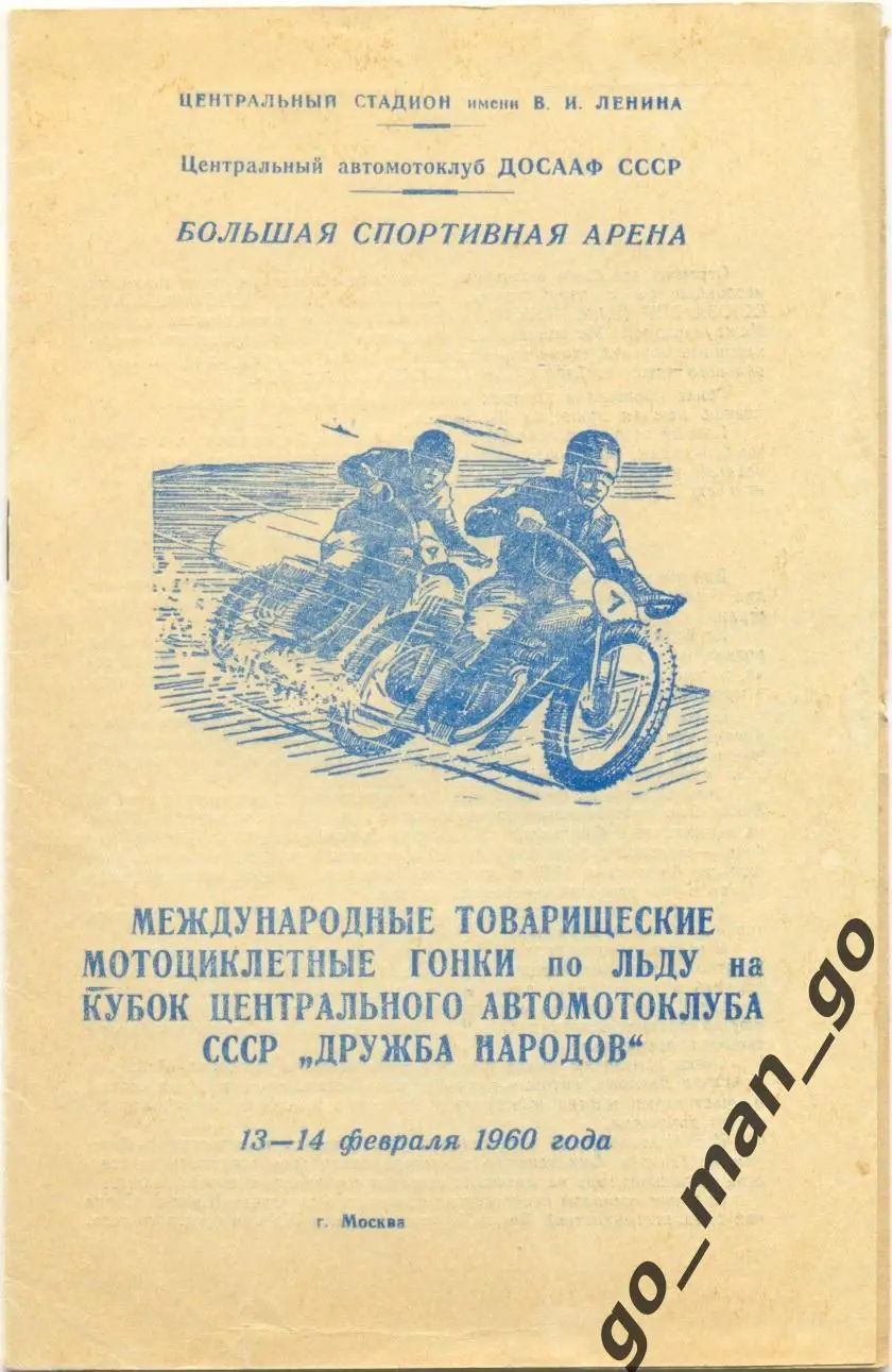 Мотоциклетные гонки по льду. Официальная программа. Кубок Центрального автомотоклуба СССР «Дружба народов» 13-14.02.1960. 8 стр. + вкладыш с составами участников 4 стр.