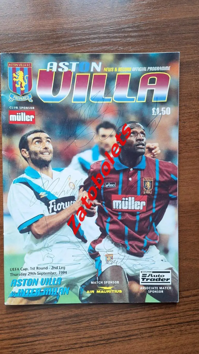 Асто Вилла Англия - Интер Италия 1994 Кубок УЕФА Автографы