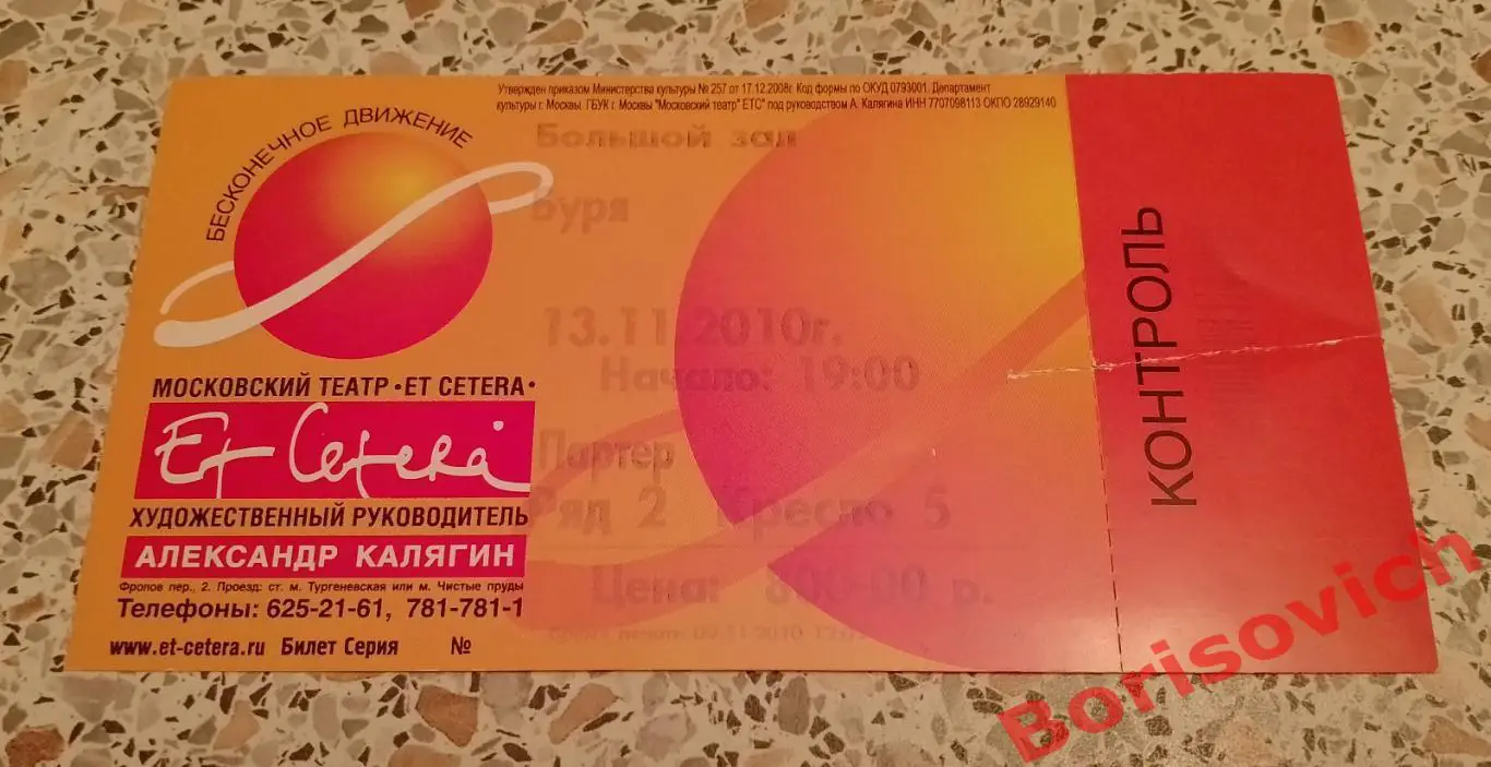 Билет Театр ET CETERA Худ рук А. Калягин БУРЯ 2010