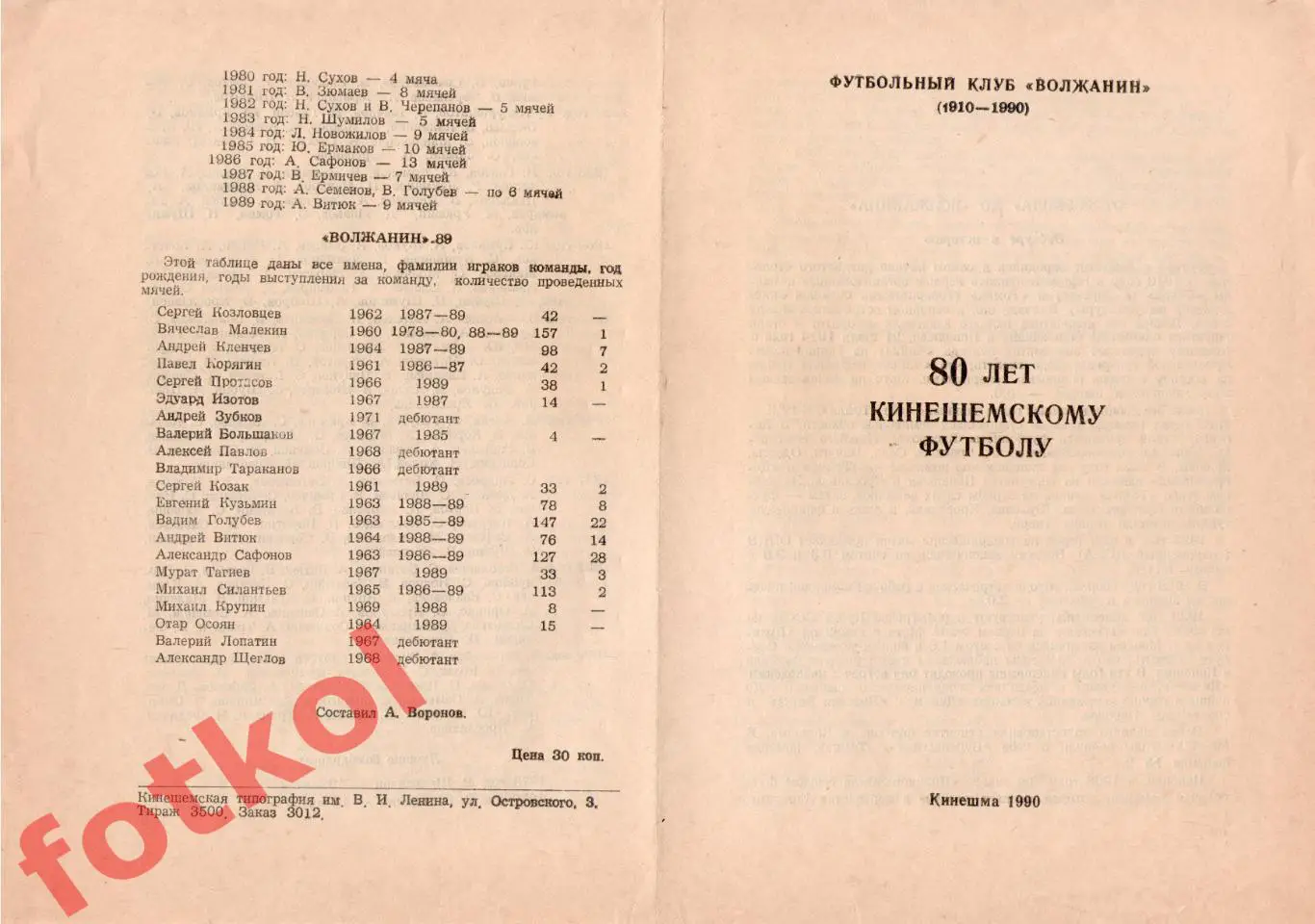 ВОЛЖАНИН Кинешма 1990 80 лет футболу