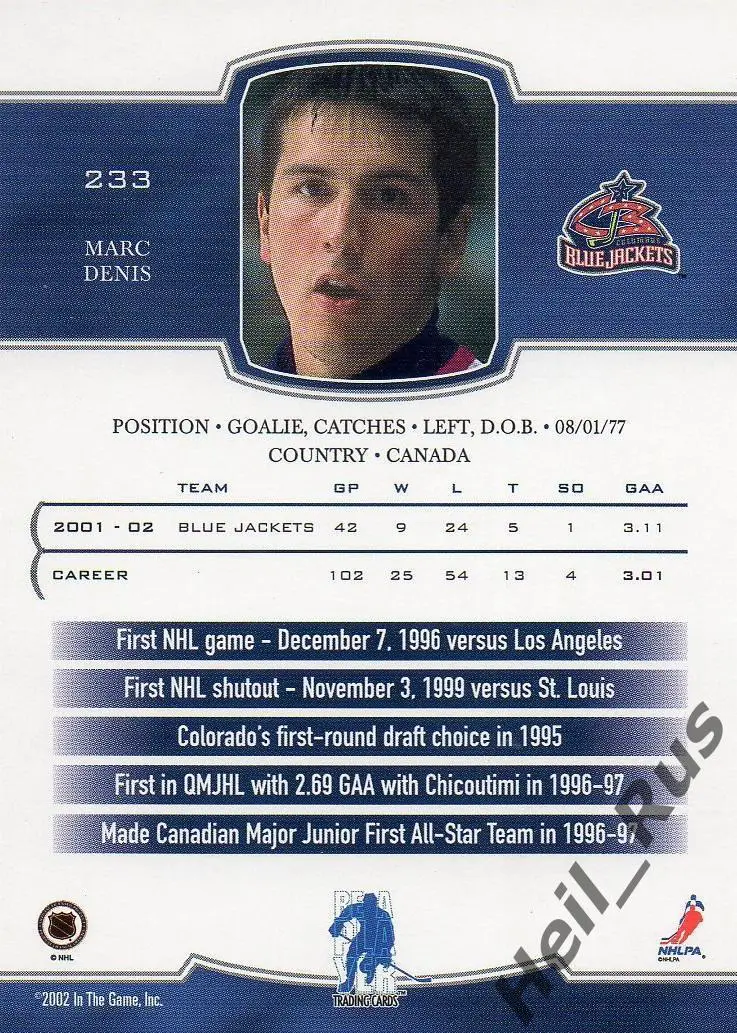 Хоккей. Карточка Marc Denis/Марк Дени (Columbus Blue Jackets/Коламбус) НХЛ/NHL