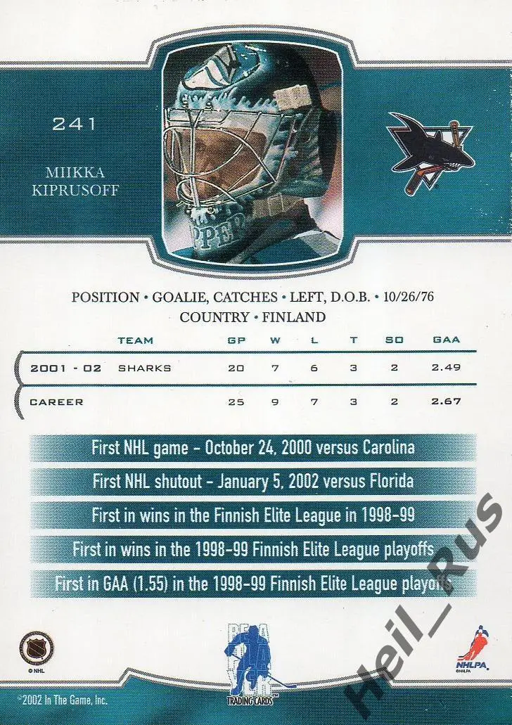 Карточка Miikka Kiprusoff/Миикка Кипрусофф (San Jose Sharks/Сан-Хосе) NHL/НХЛ