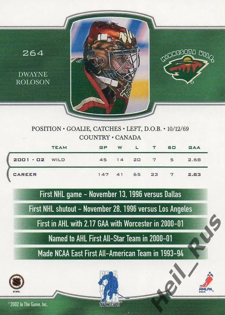 Хоккей. Карточка Dwayne Roloson/Дуэйн Ролосон Minnesota Wild / Миннесота НХЛ/NHL