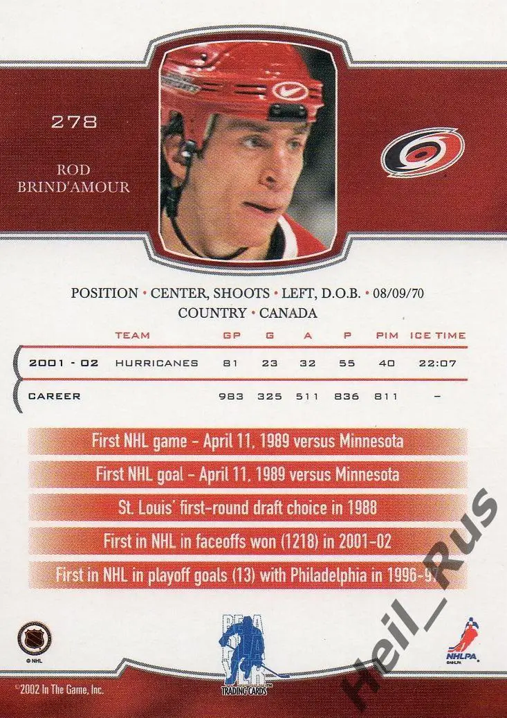 Карточка Rod Brind'Amour/Род Бриндамор (Carolina Hurricanes/Каролина) НХЛ/NHL