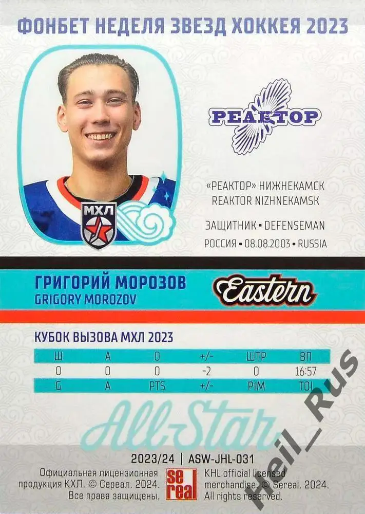 Карточка Григорий Морозов (Реактор Нижнекамск) Кубок Вызова МХЛ/КХЛ 2023 SeReal