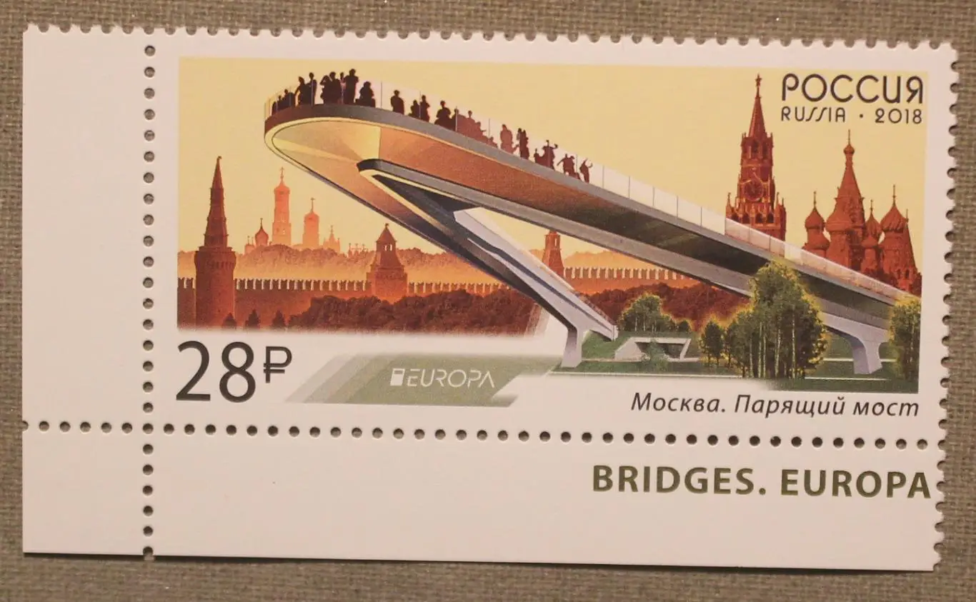 Продаеются марка с левым и нижним полями Почты России, выпущенная в 2018 году по программе "Европа" и посвященная Парящему мосту в Москве. Мост открыт в парке «Зарядье» в сентябре 2017 года. Парящий мост представляет собой смотровую площадку в виде латинской буквы «V». В основе конструкции — не имеющая ни единой опоры семидесятиметровая смотровая площадка с высокими стеклянными ограждениями. Протяжённость моста — 244 метра, вес — 3700 тонн. На почтовой марке изображён Парящий мост над Москвой-рекой на фоне Кремля и логотип Europa. Состояние - на фото.