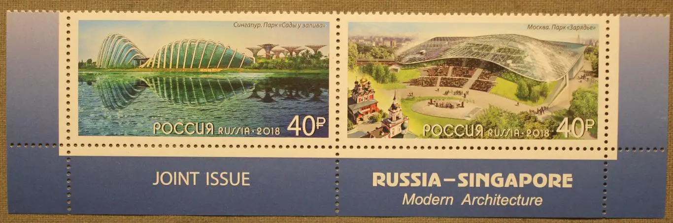 Продается негашеная сцепка из двух марок с боковыми и нижним полями Почты России, выпущенных в 2018 году и посвященная 50-летию установления дипломатических отношений между Российской Федерацией и Республикой Сингапур. Совместный выпуск почтовых марок посвящён современной архитектуре. В качестве сюжетов марок выбраны парк «Зарядье» в Москве и «Сады у залива» в Сингапуре.