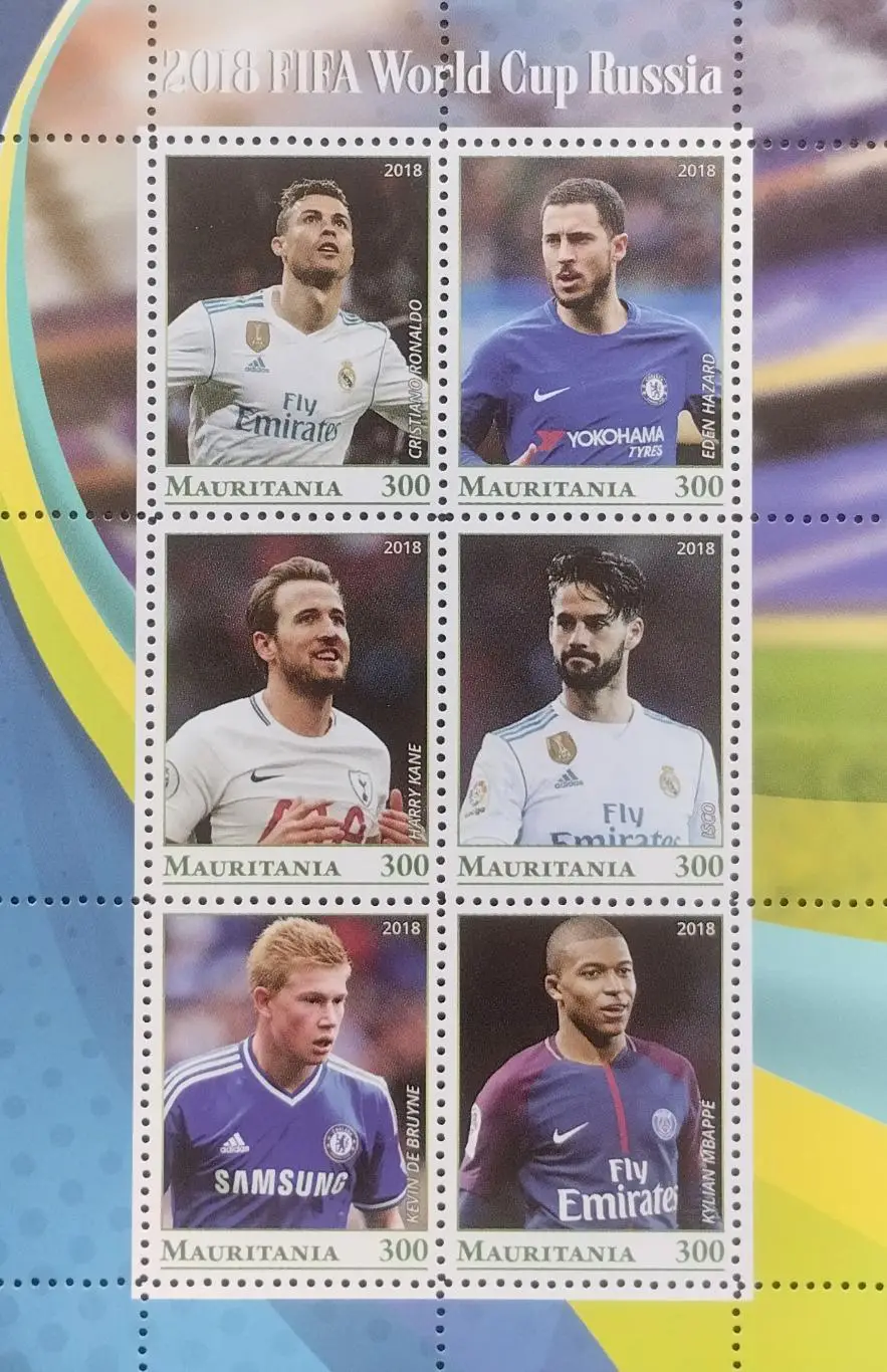 Малый лист. Мавритания 2018. Роналду. Азар. Кейн. Иско. Де Брёйне. Мбаппе.