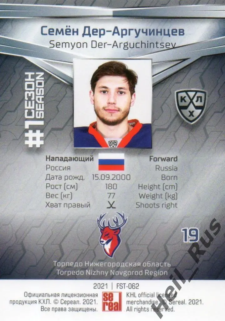 Хоккей. Карточка Семен Дер-Аргучинцев Торпедо Нижний Новгород КХЛ 2020/21 SeReal