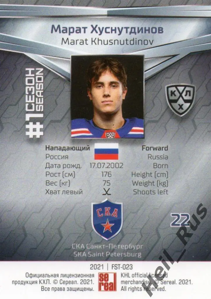 Хоккей. Карточка Марат Хуснутдинов СКА Санкт-Петербург КХЛ сезон 2020/21 SeReal