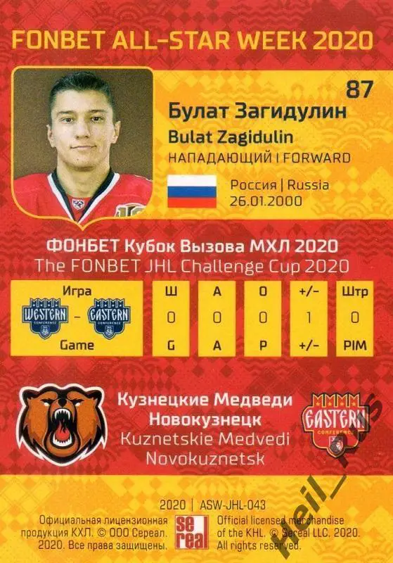 Карточка Булат Загидулин Кузнецкие Медведи Новокузнецк МХЛ/КХЛ Неделя Звезд 2020