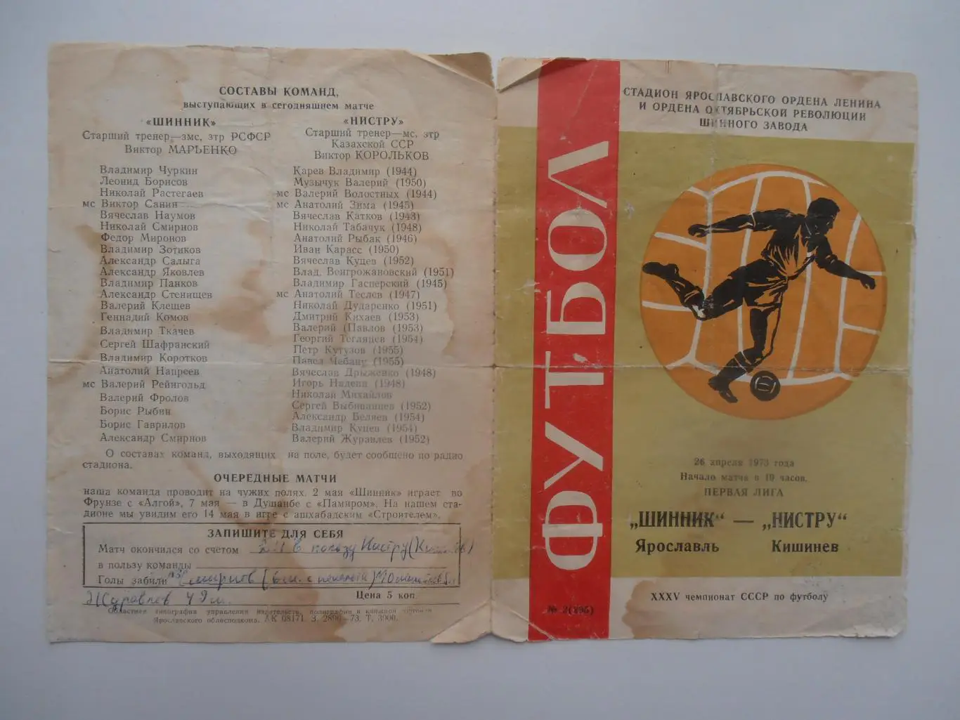Шинник Ярославль-Нистру Кишинев 26 апреля 1973