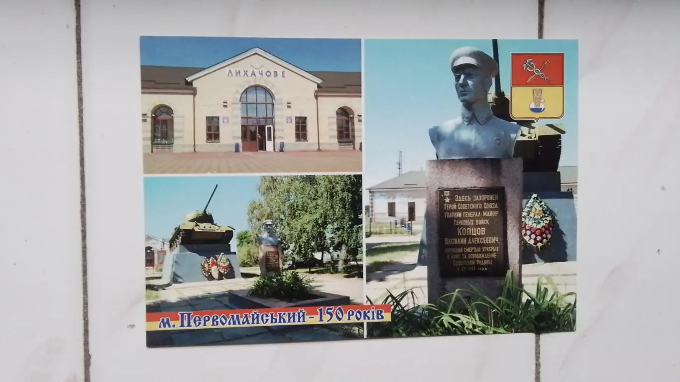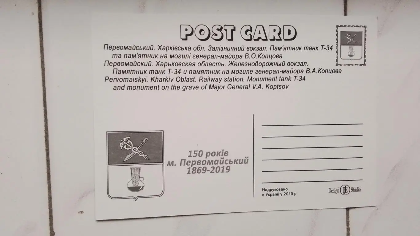 Цветная открытка-коллаж N 3 из минисерии Городу Первомайский / ныне Златополь - 150 лет. Харьковская область. 1. Железнодорожный вокзал.2. Памятник танку Т-34.3. Памятник на могиле генерала-майора В.А. Копцова.2019 год выпуска.