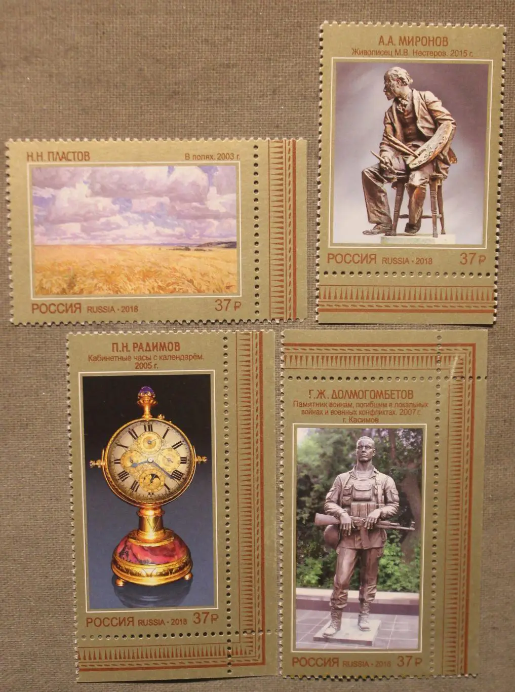 Продается набор из 4 негашеных марок с полями из серии "Современное искусство России" Почты России, выпущенных в 2018 году. На почтовых марках изображены работы современных авторов: памятник воинам, погибшим в локальных войнах и военных конфликтах (2007) Г.Ж.Долмогомбетова; скульптура «Живописец М.В. Нестеров» (2015) А.А.Миронова; картина «В полях» (2003) Н.Н. Пластова; кабинетные часы с календарём (2005) П.Н.Радимова. Состояние - на фото.