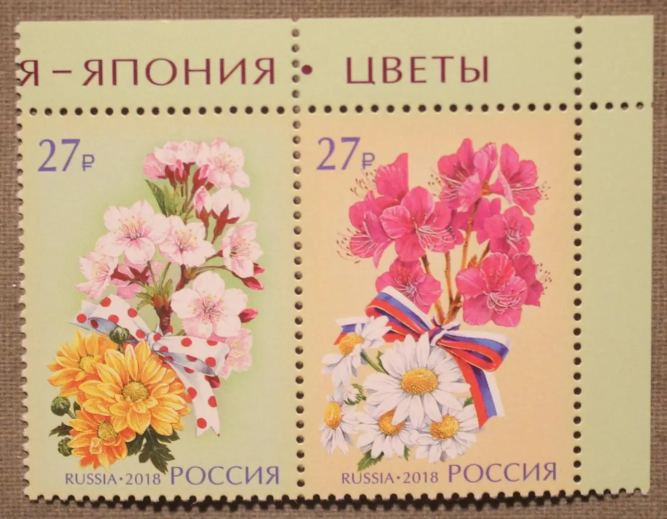 Продается негашеная сцепка из двух марок с верхним и правым полями Почты России, выпущенных в 2018 году. 2018 год объявлен Годом России в Японии и Японии в России. Основная цель организации перекрёстного года — дальнейшее развитие и укрепление российско-японских отношений.