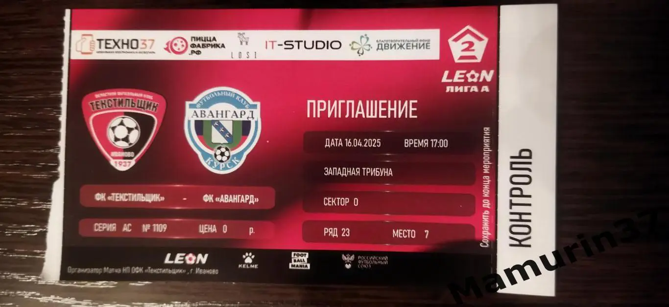 Билет Текстильщик Иваново - Авангард Курск 16.04.2025