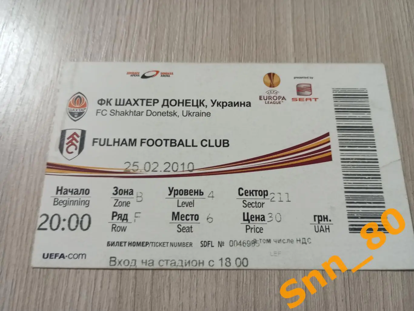 Билет Шахтер (Донецк, Украина) - Фулхэм (Лондон, Англия) 2010