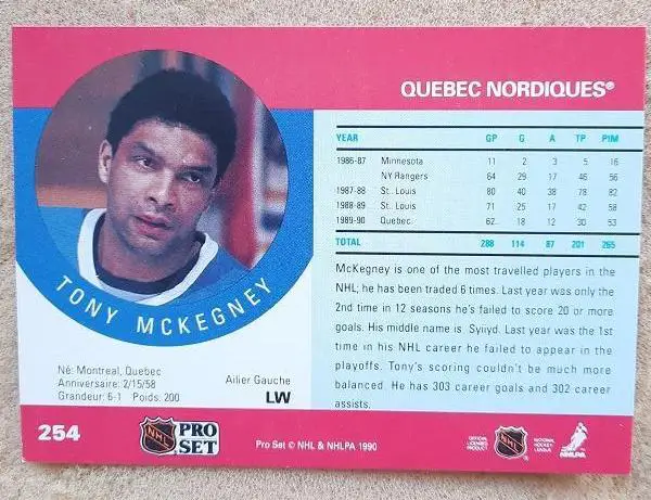 карточка хоккей НХЛ Тони Маккегней Квебек Нордикс № 254 выпуск 1990-91 ProSet Hockey, состояние на фото