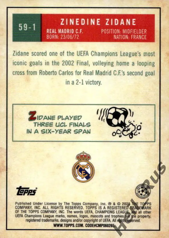 Футбол. Карточка Зинедин Зидан Реал Мадрид, Ювентус Лига Чемпионов 2022-23 TOPPS