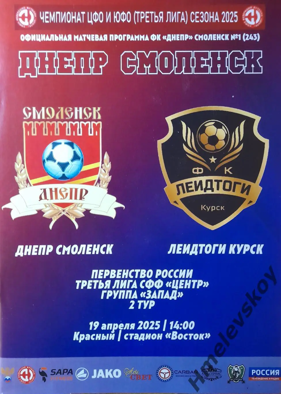 Официальная программа Первенства России по футболу среди ЛФЛ, Третья лига, СФФ "Центр", группа "Запад", Первый этап. "Днепр" (Смоленск) - "ЛеидТоги" (Курск), 19 апреля 2025 года, п. Красный.