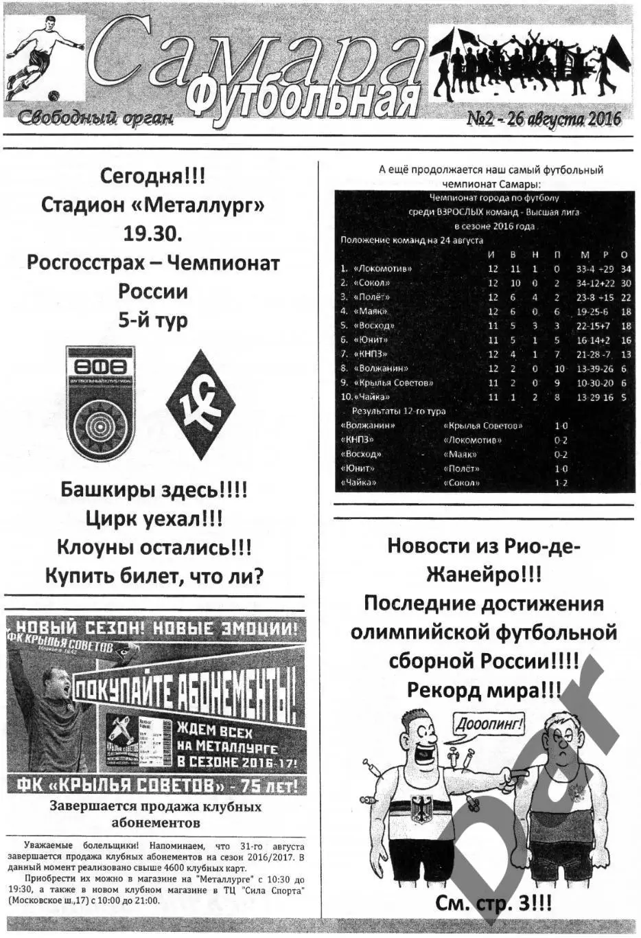 фанат. программка Крылья Советов Самара - Уфа 26.08.2016 Футбольная Самара №2