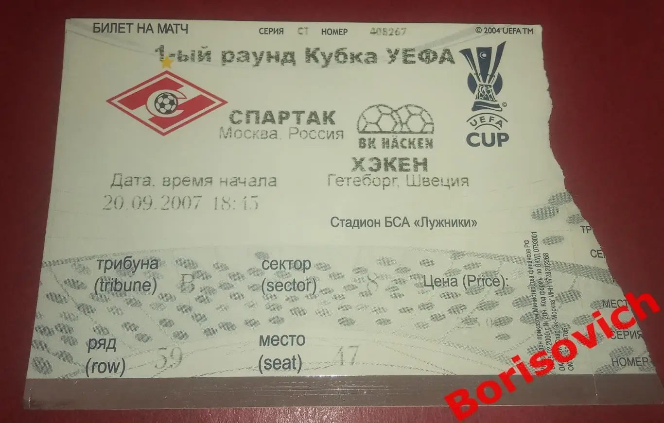 Билет Спартак Москва - Хэкен Гётеборг 20-09-2007 О