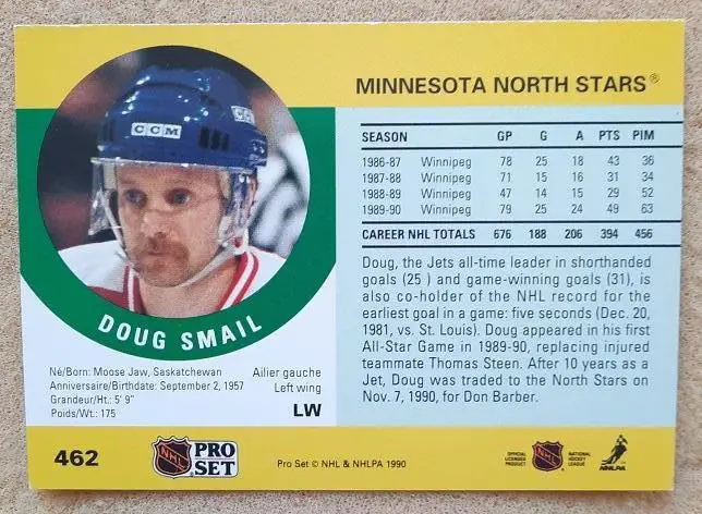карточка хоккей НХЛ Дуг Смайл Миннесота Норт Старз № 462 выпуск 1990-91 ProSet Hockey, состояние на фото