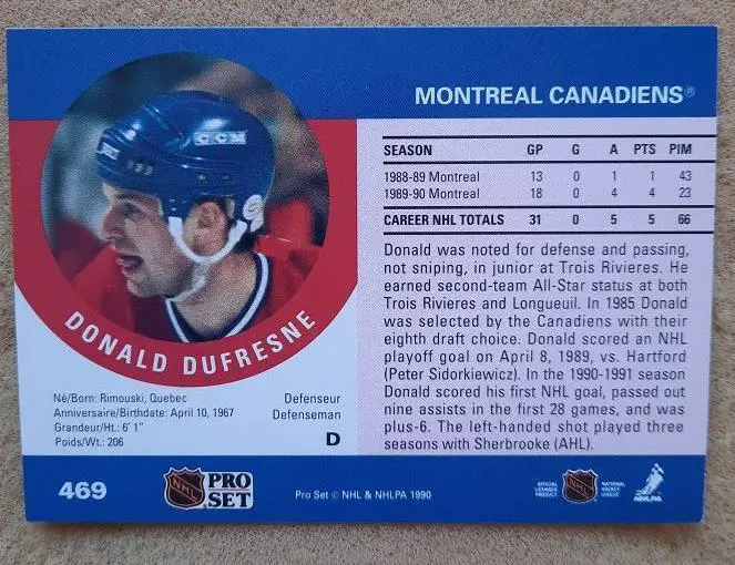 карточка хоккей НХЛ Дональд Дюфресн Монреаль Канадиенс № 469 выпуск 1990-91 ProSet Hockey, состояние на фото