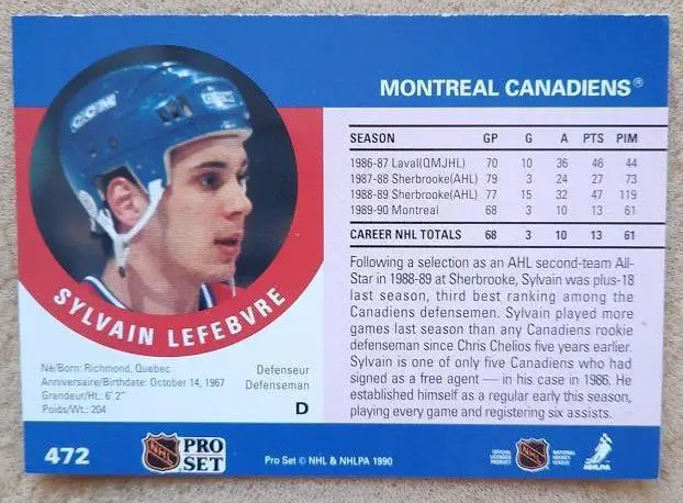 карточка хоккей НХЛ Сильвен Лефевр Монреаль Канадиенс № 472 выпуск 1990-91 ProSet Hockey, состояние на фото