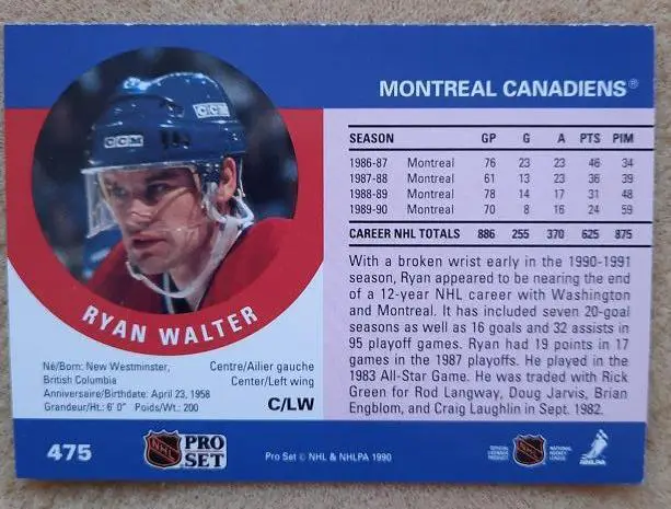 карточка хоккей НХЛ Райан Уолтер Монреаль Канадиенс № 475 выпуск 1990-91 ProSet Hockey, состояние на фото