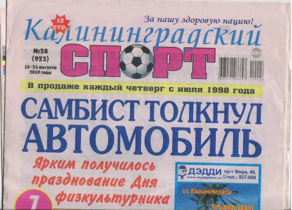 Газета Калининградский спорт № 28 (923) за 15.-21.08.2019 на 12 страницах. Обзор матча Мордовия Саранск - Балтика 10.08.2019. История Балтики, летопись. Регби, подготовка к чемпионату Европы, Обзор чемпионат области, любительской лиги и многое другое. Интервью с А.Румянцевым