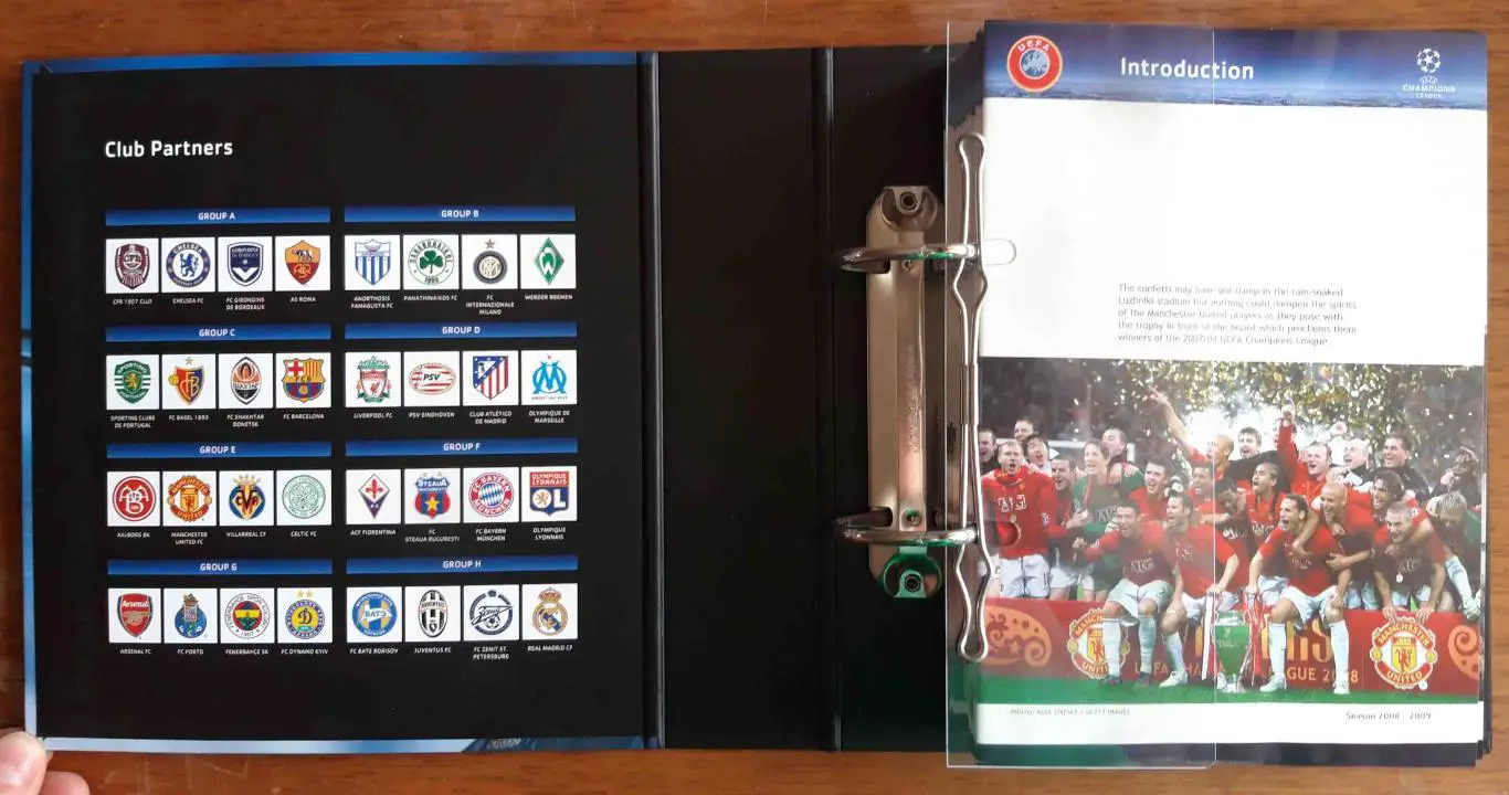 Ежегодный справочник, официальный продукт УЕФА к новому сезону Лиги чемпионов. Сезон-2008/2009 (есть и другие, узнавайте, оптом - дешевле). Компактный и удобный в пользовании: брошюрки на скоросшивателе - история и статистика, представление каждого клуба-участника группового турнира (с визиткой и фото каждого игрока), много другой важной и полезной информации.